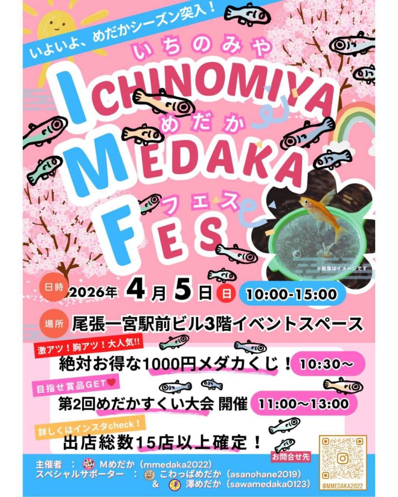 投稿日: 2026年2月18日今、シーズンはじめてのイベントのご案内✨✨ まだまだ寒い日も続いたりしてますが、もうじき春になり、いよいよめだかシーズンに入るかなと思います🌸 今シーズンはじめてのイベントが決まりましたのでご連絡します😊 4月5日(日) 尾張一宮駅前ビルにて‼️ ぜひ興味のある方はお越しください!!